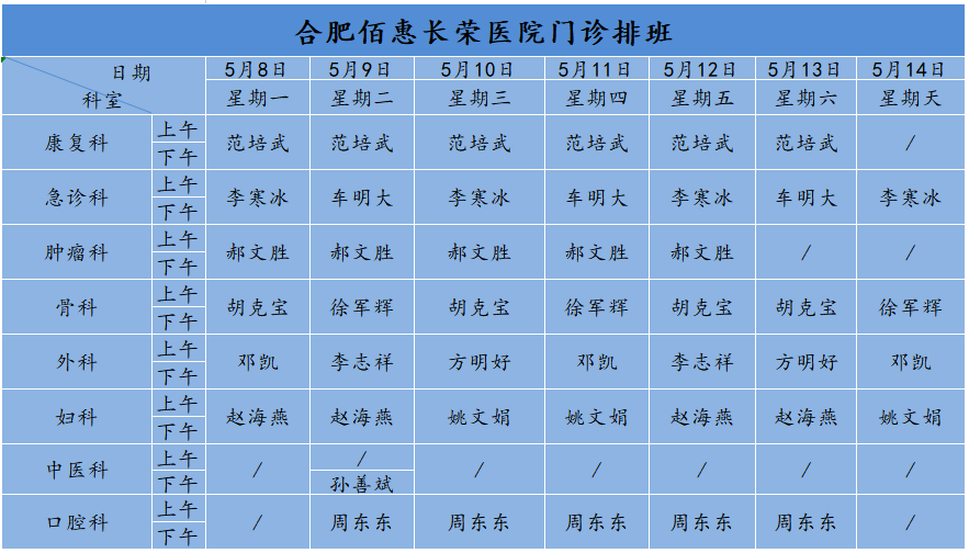 佰惠就診丨5月8日-5月14日門診排班安排