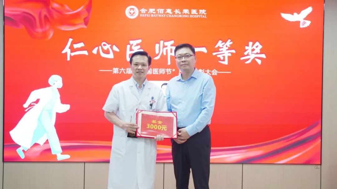 ▲佰澤醫(yī)療集團(tuán)副總裁、合肥佰惠長榮醫(yī)院院長盧繼忠為“仁心醫(yī)師”一等獎獲得者頒獎