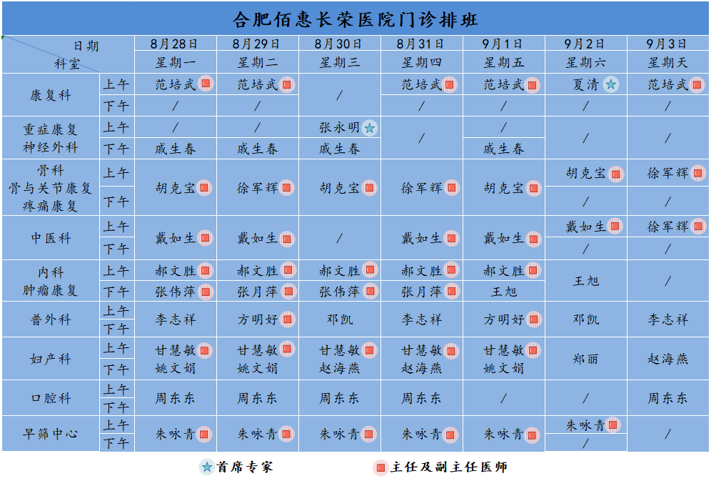 為方便廣大市民了解合肥佰惠長榮醫(yī)院門診醫(yī)師出診安排,現(xiàn)發(fā)布下周(8月28日-9月3日)門診醫(yī)師排班表,請(qǐng)大家合理安排就診時(shí)間。如遇停診、換診等特殊情況有所調(diào)整,以當(dāng)日出診安排為準(zhǔn),造成不便敬請(qǐng)諒解!