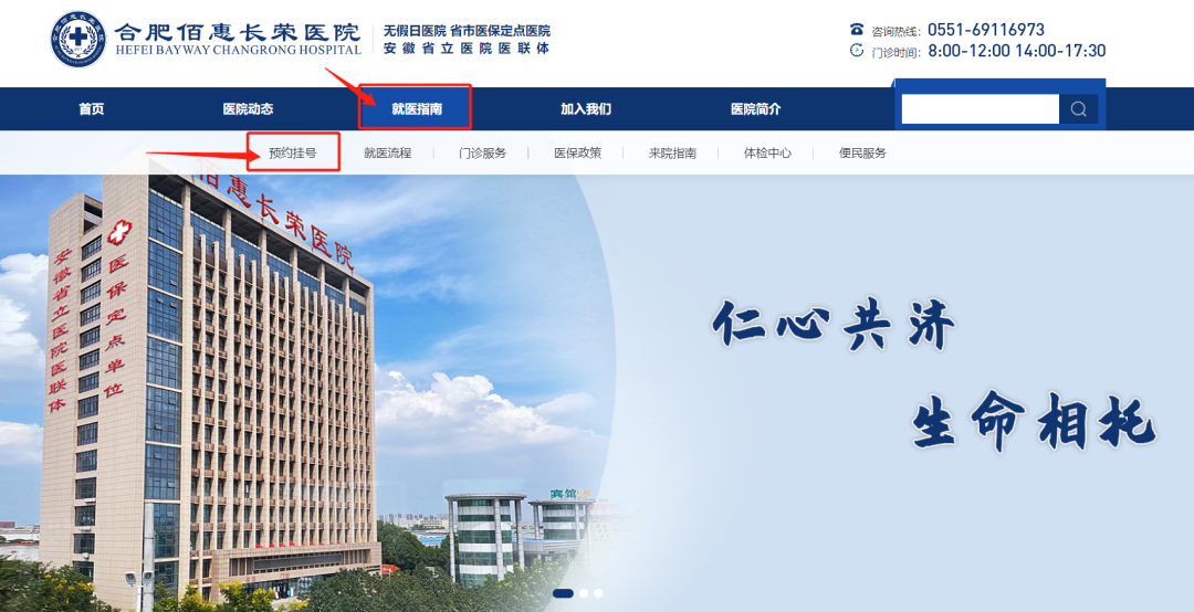 ①線上:百度搜索“合肥佰惠長榮醫(yī)院”或“m.365wmvip1525.com”官網(wǎng),點擊【就醫(yī)服務(wù)】中的【預(yù)約掛號】進行預(yù)約登記;(如圖所示:)