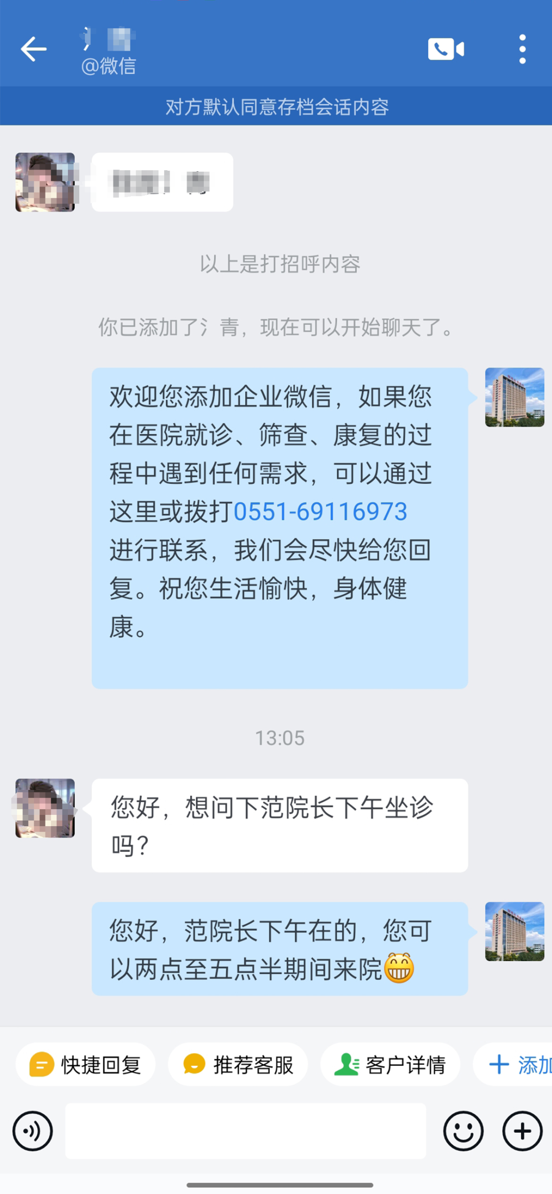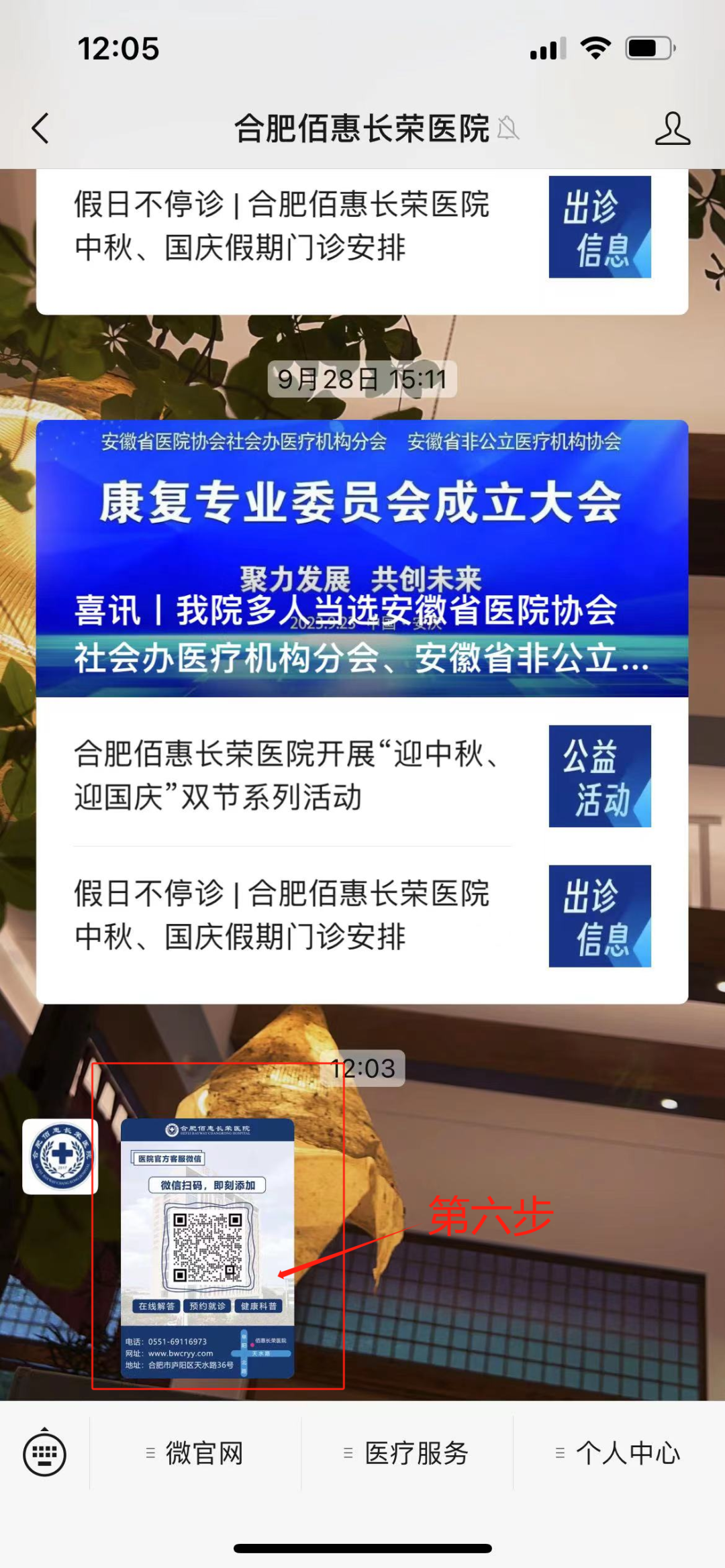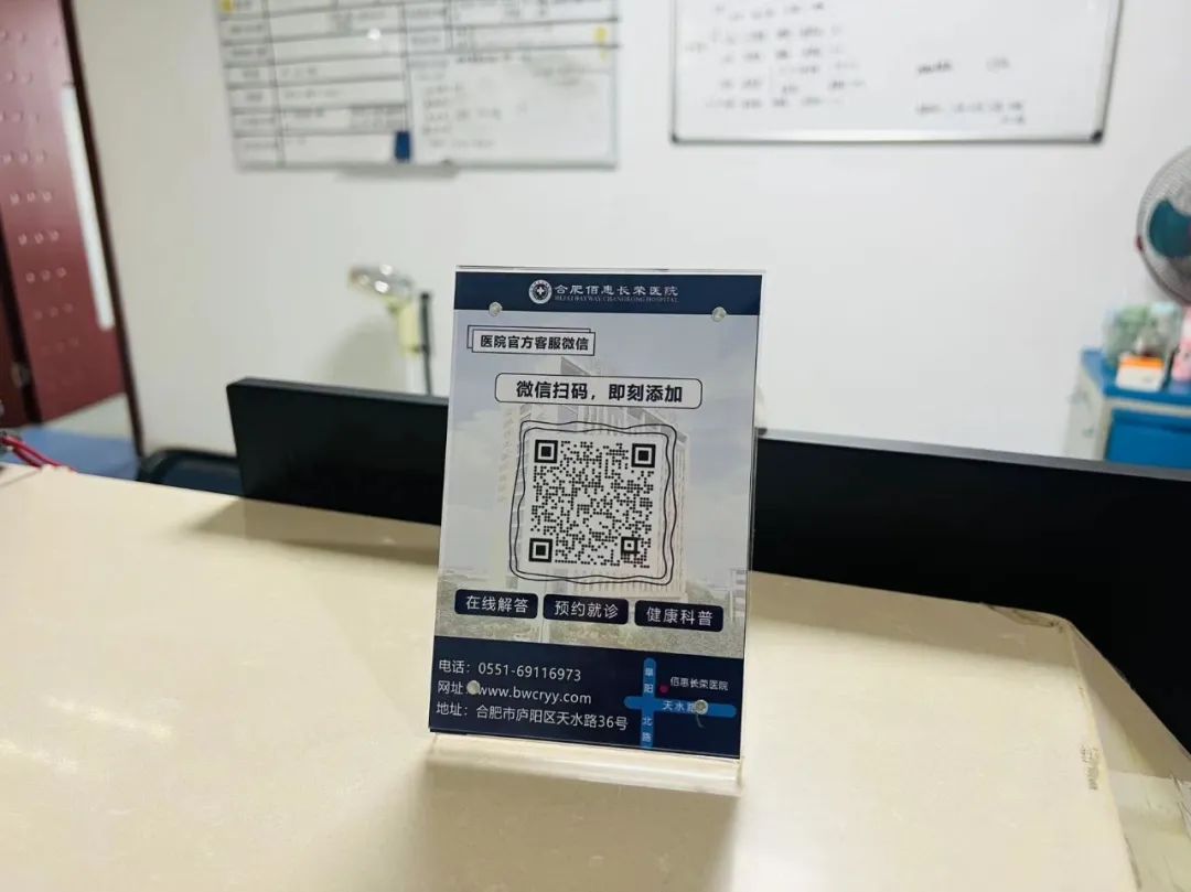 ②方式二:微信搜索“合肥佰惠長榮醫(yī)院”公眾號→【點擊關注進入首頁】→【點擊“微官網”,再點擊“就診咨詢”】→【點開圖片,長按圖片識別二維碼】添加到微信通訊錄即可。③方式三:合肥佰惠長榮醫(yī)院院內各處擺放的“佰惠健康管家”臺卡目前,我院已將“佰惠健康管家”微信二維碼的臺卡放置在了患者服務中心、門診、體檢中心、內鏡中心、各病區(qū)護士站等地。大家可直接“微信掃描二維碼”進行添加。
