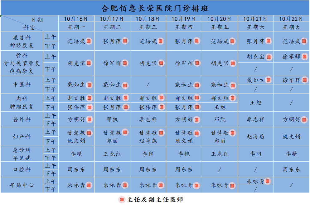 為方便廣大市民了解合肥佰惠長(zhǎng)榮醫(yī)院門診醫(yī)師出診安排,現(xiàn)發(fā)布下周(10月16日-10月22日)門診醫(yī)師排班表,請(qǐng)大家合理安排就診時(shí)間。如遇停診、換診等特殊情況有所調(diào)整,以當(dāng)日出診安排為準(zhǔn),造成不便敬請(qǐng)諒解!