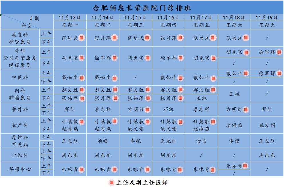 為方便廣大市民了解合肥佰惠長(zhǎng)榮醫(yī)院門診醫(yī)師出診安排,現(xiàn)發(fā)布下周(11月13日-11月19日)門診醫(yī)師排班表,請(qǐng)大家合理安排就診時(shí)間。如遇停診、換診等特殊情況有所調(diào)整,以當(dāng)日出診安排為準(zhǔn),造成不便敬請(qǐng)諒解!