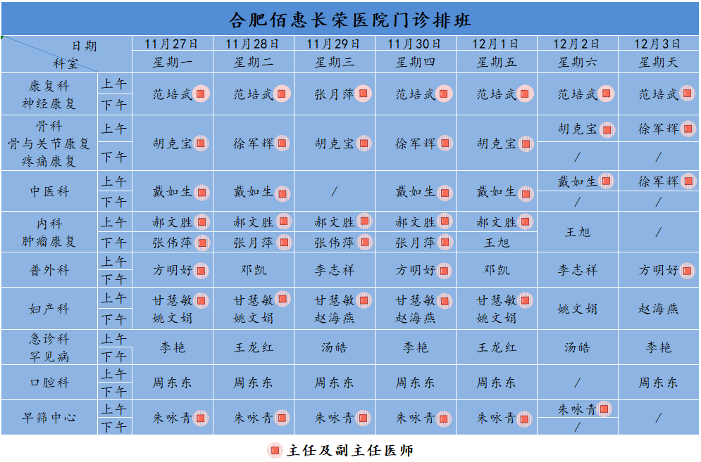 為方便廣大市民了解合肥佰惠長榮醫(yī)院門診醫(yī)師出診安排,現(xiàn)發(fā)布下周(11月27日-12月3日)門診醫(yī)師排班表,請大家合理安排就診時間。如遇停診、換診等特殊情況有所調(diào)整,以當(dāng)日出診安排為準(zhǔn),造成不便敬請諒解!