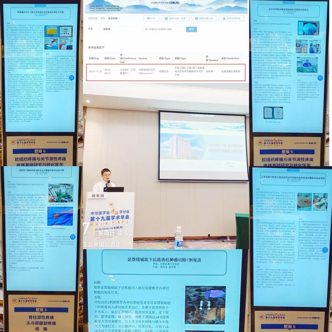 備受關(guān)注的是,此次年會(huì)安徽省共投稿11篇論文,而由我院骨科/骨科康復(fù)胡克寶主任和徐軍輝副主任醫(yī)師投稿的6篇論文全數(shù)被錄用。其中《顯微鏡下腰椎間盤切除術(shù)治療腰椎間盤突出癥29例》、《初學(xué)者開(kāi)展單側(cè)雙通道脊柱內(nèi)鏡技術(shù)的體會(huì)》、《顯微鏡輔助下后路脊柱腫瘤切除1例報(bào)道》、《青藤堿定點(diǎn)介入聯(lián)合中藥溻漬治療新冠后脊柱關(guān)節(jié)痛》、《正清風(fēng)痛寧電致孔透皮給藥治療四肢外傷性軟組織腫脹的臨床觀察》5篇論文被大會(huì)選為電子壁報(bào)展示,此外,《中醫(yī)可視針刀鏡+鏡下臭氧灌洗治療老年性膝骨性關(guān)節(jié)炎》論文則由合肥佰惠長(zhǎng)榮醫(yī)院骨科/骨科康復(fù)副主任醫(yī)師徐軍輝(論文作者)在會(huì)上進(jìn)行專題學(xué)術(shù)報(bào)告,其精彩演講引起了與會(huì)人員的熱烈反響,并受到了高度贊賞。