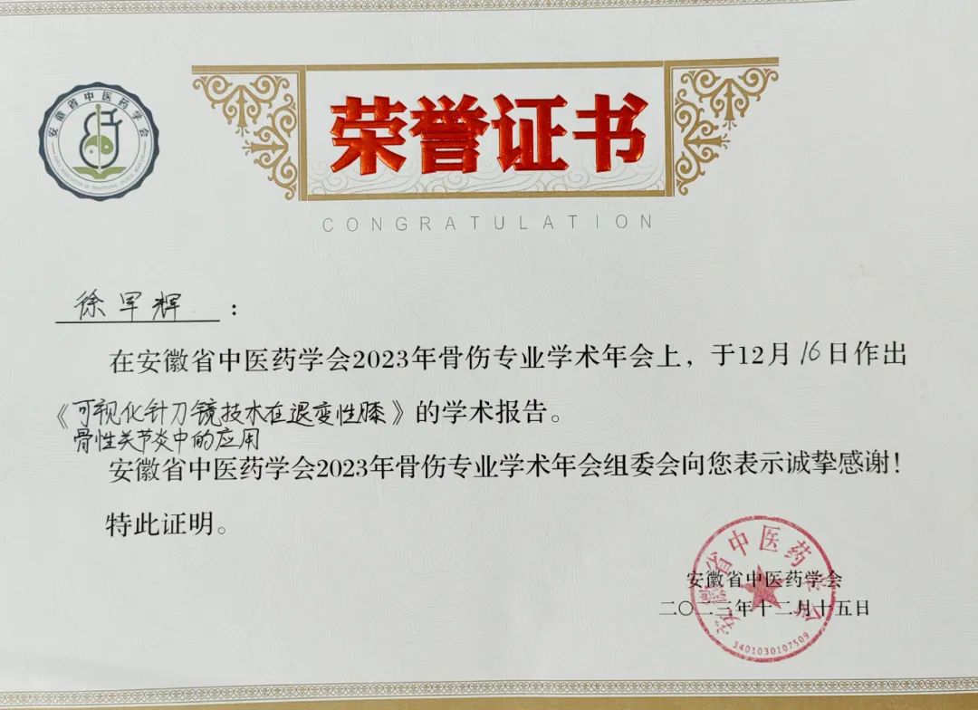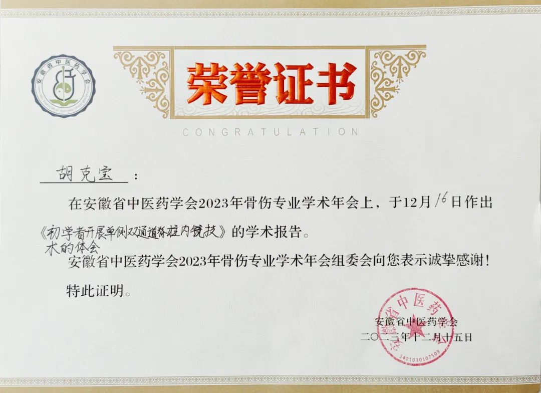 此外,我院骨科/骨科康復(fù)科主任胡克寶和副主任醫(yī)師徐軍輝于12月16日所作的《初學(xué)者開展單側(cè)雙通道脊柱內(nèi)鏡技術(shù)體會》和《可視化針刀鏡技術(shù)在退變性膝骨性關(guān)節(jié)炎中的應(yīng)用》學(xué)術(shù)報(bào)告受到了安徽省中醫(yī)藥學(xué)會2023年骨傷專業(yè)學(xué)術(shù)年會組委會的誠摯感謝,并授予了榮譽(yù)證書。