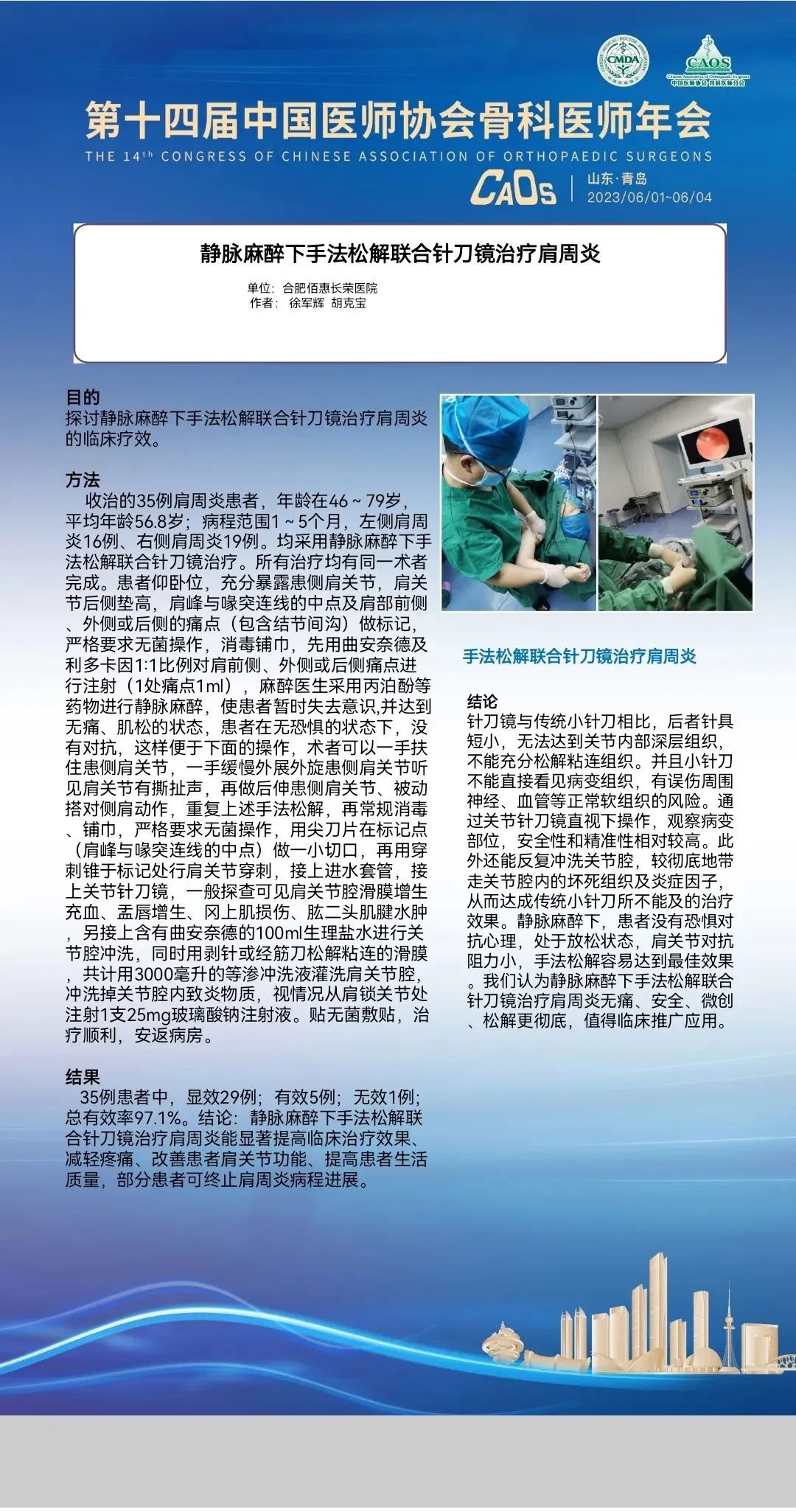 由我院骨科主任胡克寶、副主任醫(yī)師徐軍輝共同撰寫的多篇論文均被中華醫(yī)學(xué)會疼痛學(xué)分會第十九屆學(xué)術(shù)年會選中,屆時(shí)將以大會發(fā)言交流和電子壁報(bào)交流的形式在全國疼痛年會上展示。