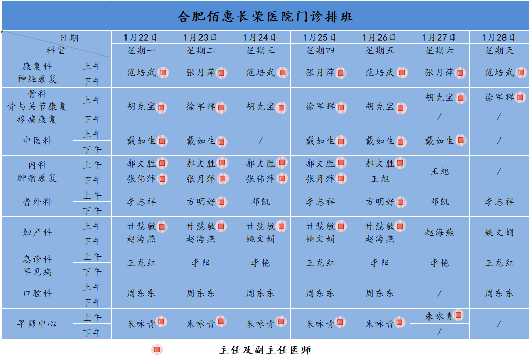 為方便廣大市民了解合肥佰惠長榮醫(yī)院門診醫(yī)師出診安排,現(xiàn)發(fā)布下周(1月22日-1月28日)門診醫(yī)師排班表,請大家合理安排就診時間。如遇停診、換診等特殊情況有所調(diào)整,以當日出診安排為準,造成不便敬請諒解!