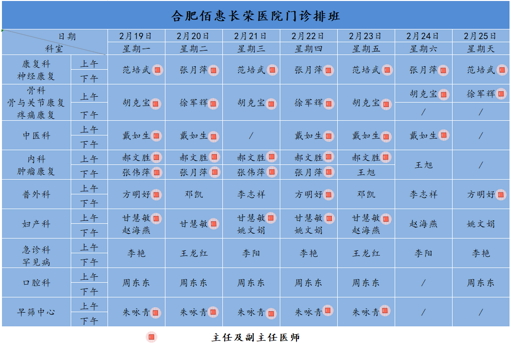 為方便廣大市民了解合肥佰惠長(zhǎng)榮醫(yī)院門診醫(yī)師出診安排,現(xiàn)發(fā)布下周(2月19日-2月25日)門診醫(yī)師排班表,請(qǐng)大家合理安排就診時(shí)間。如遇停診、換診等特殊情況有所調(diào)整,以當(dāng)日出診安排為準(zhǔn),造成不便敬請(qǐng)諒解!