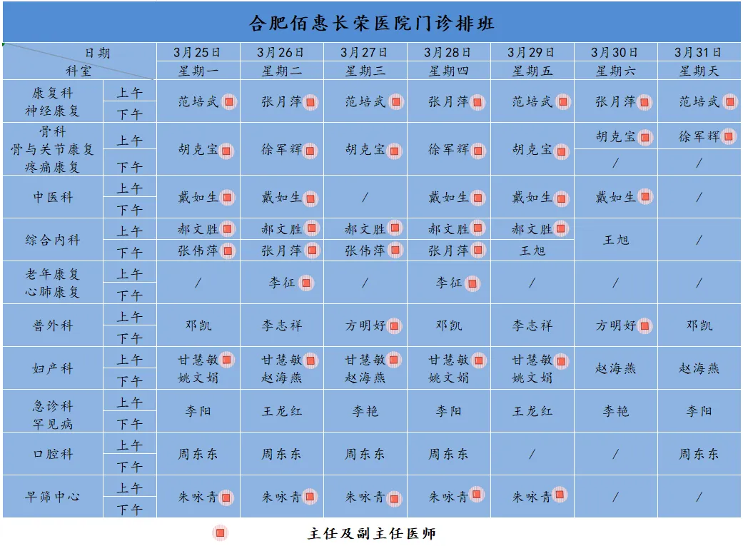 為方便廣大市民了解合肥佰惠長榮醫(yī)院門診醫(yī)師出診安排,現發(fā)布下周(3月25日-3月31日)門診醫(yī)師排班表,請大家合理安排就診時間。如遇停診、換診等特殊情況有所調整,以當日出診安排為準,造成不便敬請諒解!