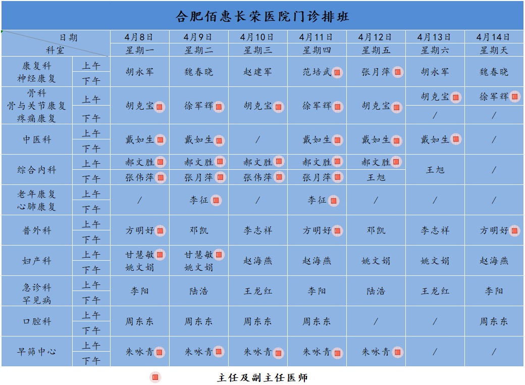 為方便廣大市民了解合肥佰惠長榮醫(yī)院門診醫(yī)師出診安排,現(xiàn)發(fā)布下周(4月8日-4月14日)門診醫(yī)師排班表,請大家合理安排就診時間。如遇停診、換診等特殊情況有所調(diào)整,以當(dāng)日出診安排為準,造成不便敬請諒解!