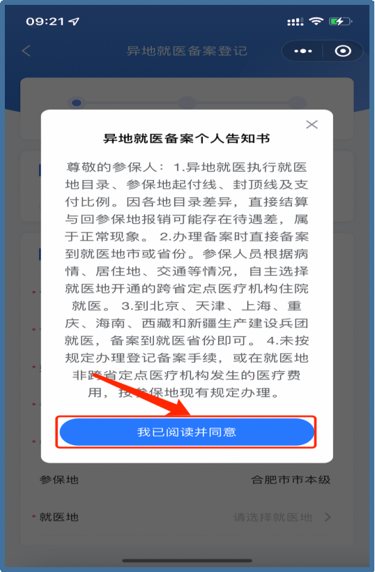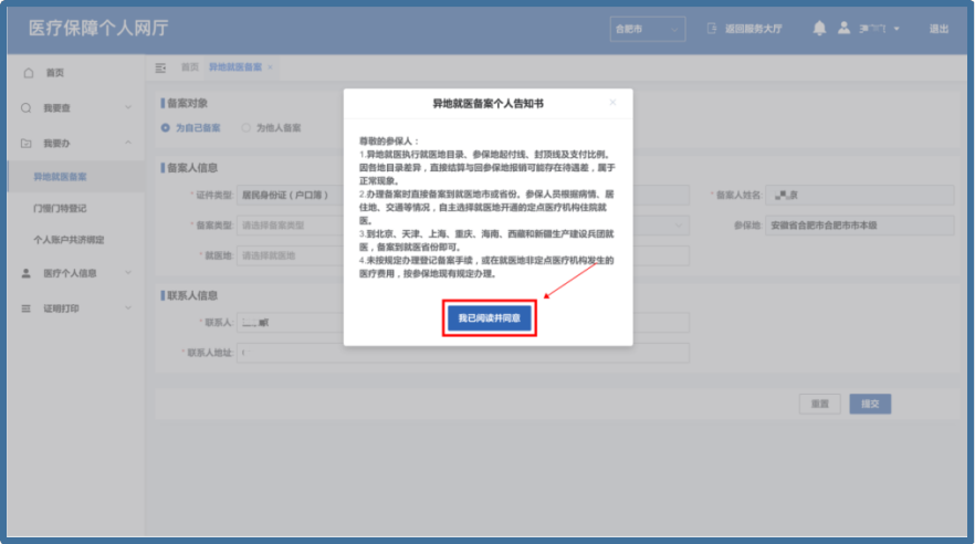 第二步:界面彈出的《異地就醫(yī)備案?jìng)€(gè)人告知書(shū)》,請(qǐng)認(rèn)真閱讀后,點(diǎn)擊【我已閱讀并同意】,進(jìn)入下一界面。