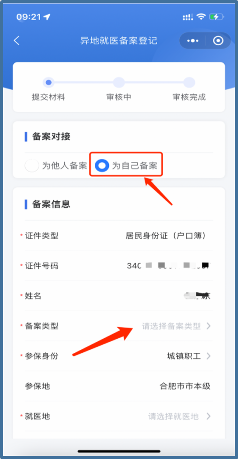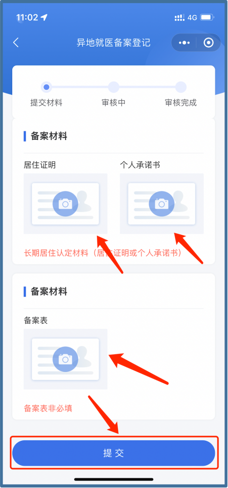 在界面上勾選【為自己備案】,選擇【備案類(lèi)型】、就醫(yī)地、開(kāi)始日期,填寫(xiě)聯(lián)系人電話(huà)、聯(lián)系人地址等信息,按界面顯示所需的材料清單,上傳電子材料(手機(jī)等拍照的jpg格式照片即可),填寫(xiě)完成并核對(duì)無(wú)誤后,點(diǎn)擊【提交】,完成備案。