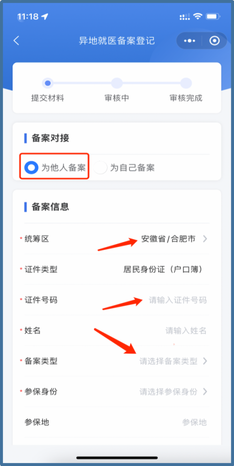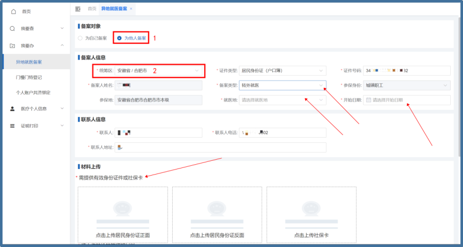 在界面上勾選【為他人備案】,選擇“他人”就醫(yī)人所在的【統(tǒng)籌區(qū)】、【證件類(lèi)型】,輸入就醫(yī)人的證件號(hào)碼,系統(tǒng)自動(dòng)查詢(xún)就醫(yī)人的參保信息,選擇備案類(lèi)型、就醫(yī)地、開(kāi)始日期,填寫(xiě)聯(lián)系人電話(huà)、聯(lián)系人地址等信息,按界面顯示所需的材料清單,上傳電子材料(手機(jī)等拍照jpg格式即可),填寫(xiě)完成并核對(duì)無(wú)誤后,點(diǎn)擊【提交】,完成備案。