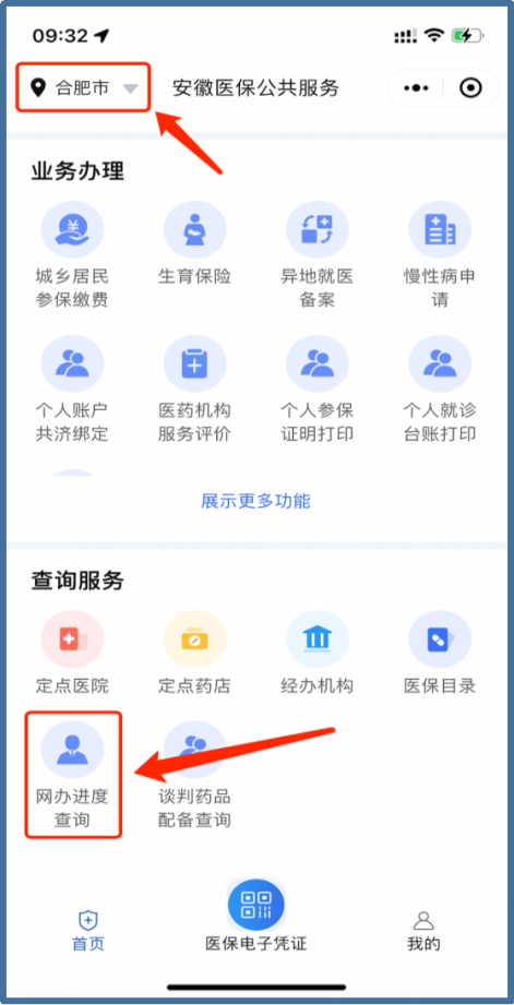 打開(kāi)“安徽醫(yī)保公共服務(wù)”微信小程序,選擇左上角本人的【參保地】(如合肥市),點(diǎn)擊“網(wǎng)辦進(jìn)度查詢(xún)”。在“網(wǎng)辦進(jìn)度查詢(xún)”界面,可以查詢(xún)到通過(guò)線(xiàn)上辦理異地就醫(yī)備案業(yè)務(wù)的進(jìn)度情況。