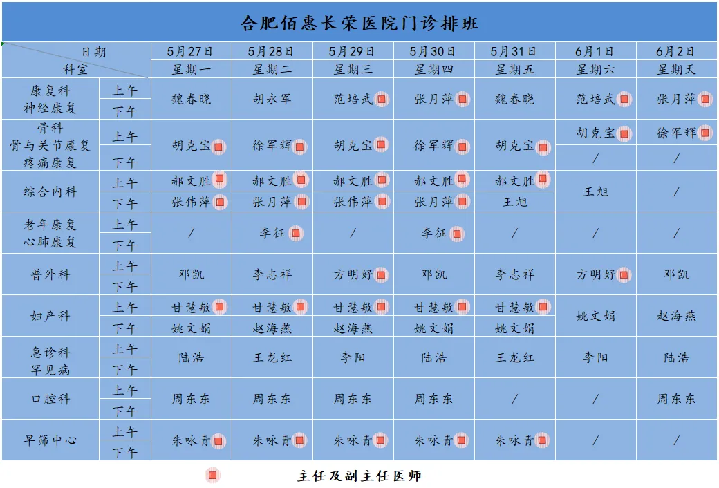 為方便廣大市民了解合肥佰惠長榮醫(yī)院門診醫(yī)師出診安排,現(xiàn)發(fā)布下周(5月27日-6月2日)門診醫(yī)師排班表,請大家合理安排就診時間。如遇停診、換診等特殊情況有所調(diào)整,以當日出診安排為準,造成不便敬請諒解!