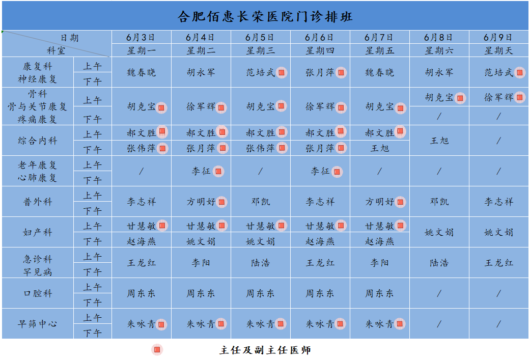 為方便廣大市民了解合肥佰惠長(zhǎng)榮醫(yī)院門診醫(yī)師出診安排,現(xiàn)發(fā)布下周(6月3日-6月9日)門診醫(yī)師排班表,請(qǐng)大家合理安排就診時(shí)間。如遇停診、換診等特殊情況有所調(diào)整,以當(dāng)日出診安排為準(zhǔn),造成不便敬請(qǐng)諒解!