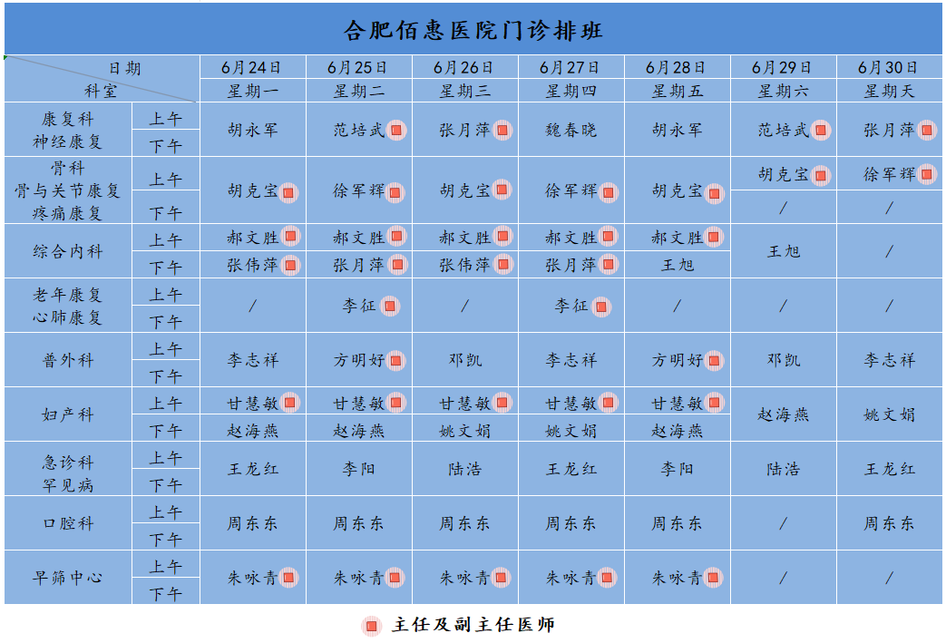 為方便廣大市民了解合肥佰惠醫(yī)院門(mén)診醫(yī)師出診安排,現(xiàn)發(fā)布下周(6月24日-6月30日)門(mén)診醫(yī)師排班表,請(qǐng)大家合理安排就診時(shí)間。如遇停診、換診等特殊情況有所調(diào)整,以當(dāng)日出診安排為準(zhǔn),造成不便敬請(qǐng)諒解!
