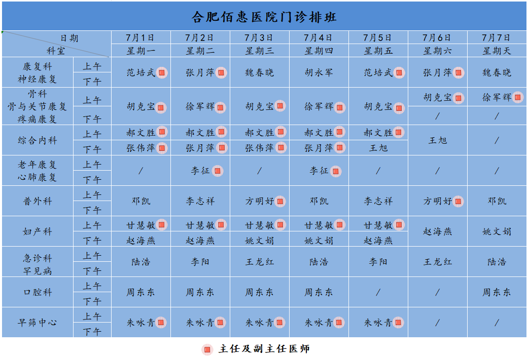 為方便廣大市民了解合肥佰惠醫(yī)院門診醫(yī)師出診安排,現(xiàn)發(fā)布下周(7月1日-7月7日)門診醫(yī)師排班表,請大家合理安排就診時間。如遇停診、換診等特殊情況有所調(diào)整,以當(dāng)日出診安排為準(zhǔn),造成不便敬請諒解!