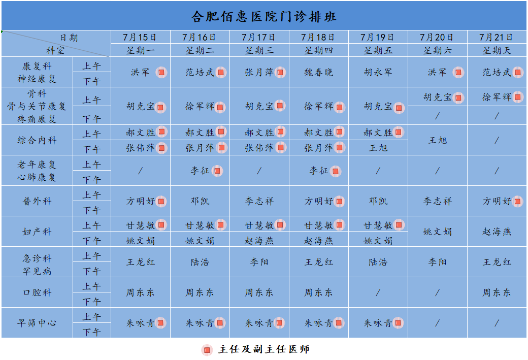 為方便廣大市民了解合肥佰惠醫(yī)院門診醫(yī)師出診安排,現(xiàn)發(fā)布下周(7月15日-7月21日)門診醫(yī)師排班表,請大家合理安排就診時間。如遇停診、換診等特殊情況有所調(diào)整,以當日出診安排為準,造成不便敬請諒解!