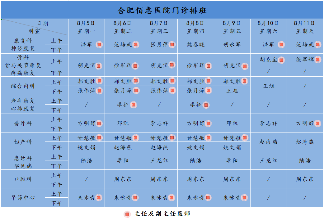 為方便廣大市民了解合肥佰惠醫(yī)院門診醫(yī)師出診安排,現(xiàn)發(fā)布下周(8月5日-8月11日)門診醫(yī)師排班表,請大家合理安排就診時間。如遇停診、換診等特殊情況有所調(diào)整,以當(dāng)日出診安排為準(zhǔn),造成不便敬請諒解!