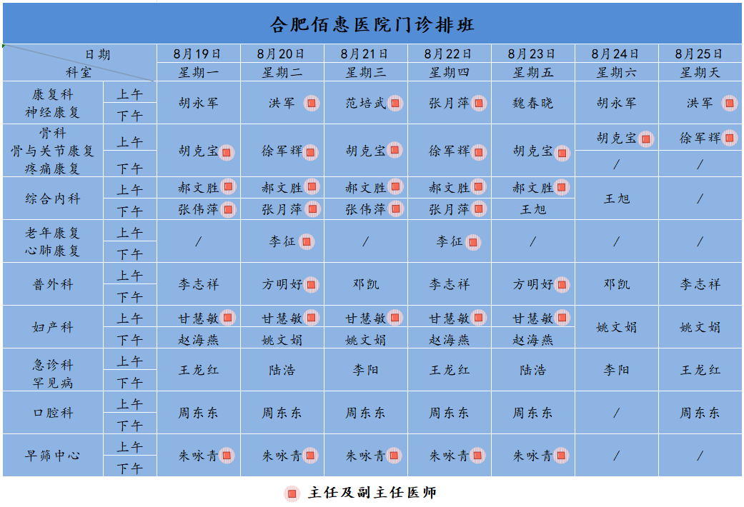 為方便廣大市民了解合肥佰惠醫(yī)院門診醫(yī)師出診安排,現(xiàn)發(fā)布下周(8月19日-8月25日)門診醫(yī)師排班表,請大家合理安排就診時間。如遇停診、換診等特殊情況有所調(diào)整,以當(dāng)日出診安排為準(zhǔn),造成不便敬請諒解!