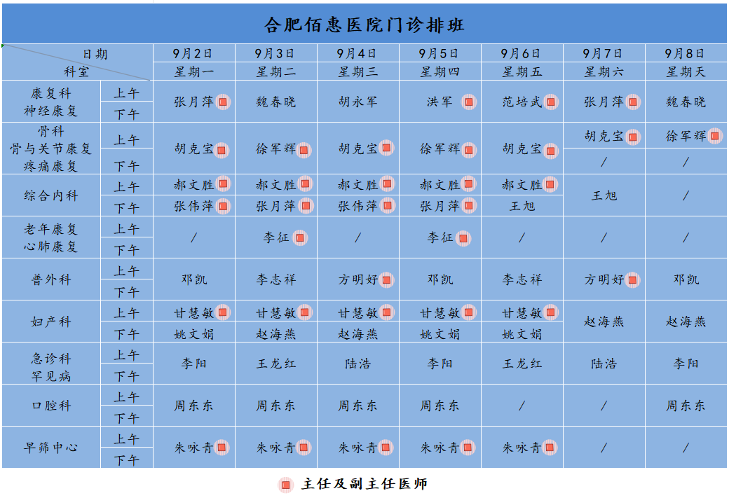 為方便廣大市民了解合肥佰惠醫(yī)院門診醫(yī)師出診安排,現(xiàn)發(fā)布下周(9月2日-9月8日)門診醫(yī)師排班表,請大家合理安排就診時間。如遇停診、換診等特殊情況有所調(diào)整,以當(dāng)日出診安排為準(zhǔn),造成不便敬請諒解!