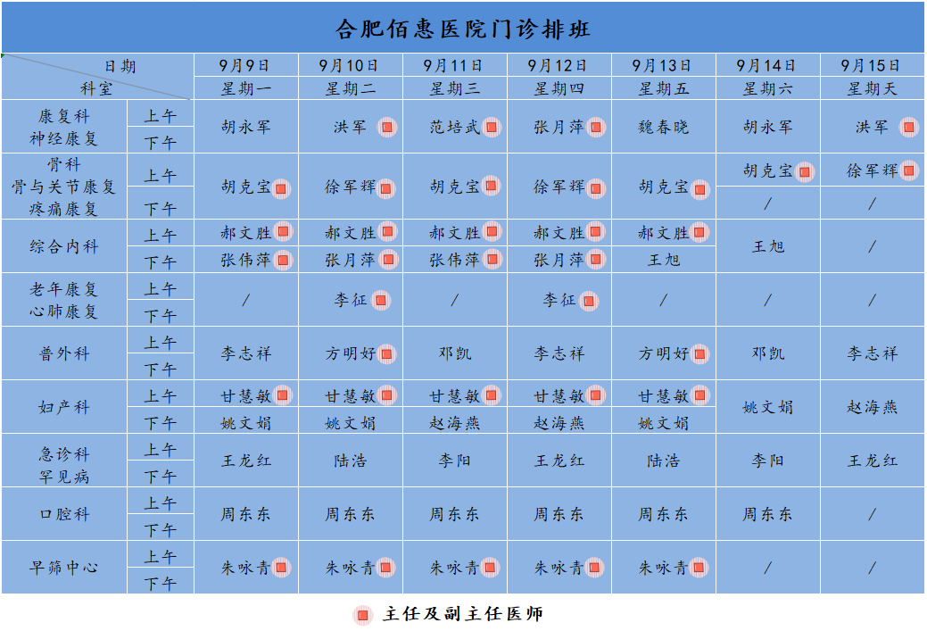 為方便廣大市民了解合肥佰惠醫(yī)院門診醫(yī)師出診安排,現(xiàn)發(fā)布下周(9月9日-9月15日)門診醫(yī)師排班表,請大家合理安排就診時(shí)間。如遇停診、換診等特殊情況有所調(diào)整,以當(dāng)日出診安排為準(zhǔn),造成不便敬請諒解!