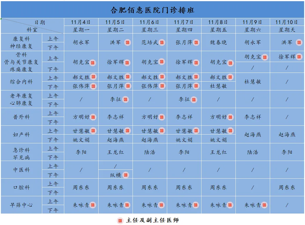 為方便廣大市民了解合肥佰惠醫(yī)院門診醫(yī)師出診安排,現(xiàn)發(fā)布下周(11月4日-11月10日)門診醫(yī)師排班表,請大家合理安排就診時間。如遇停診、換診等特殊情況有所調(diào)整,以當日出診安排為準,造成不便敬請諒解!