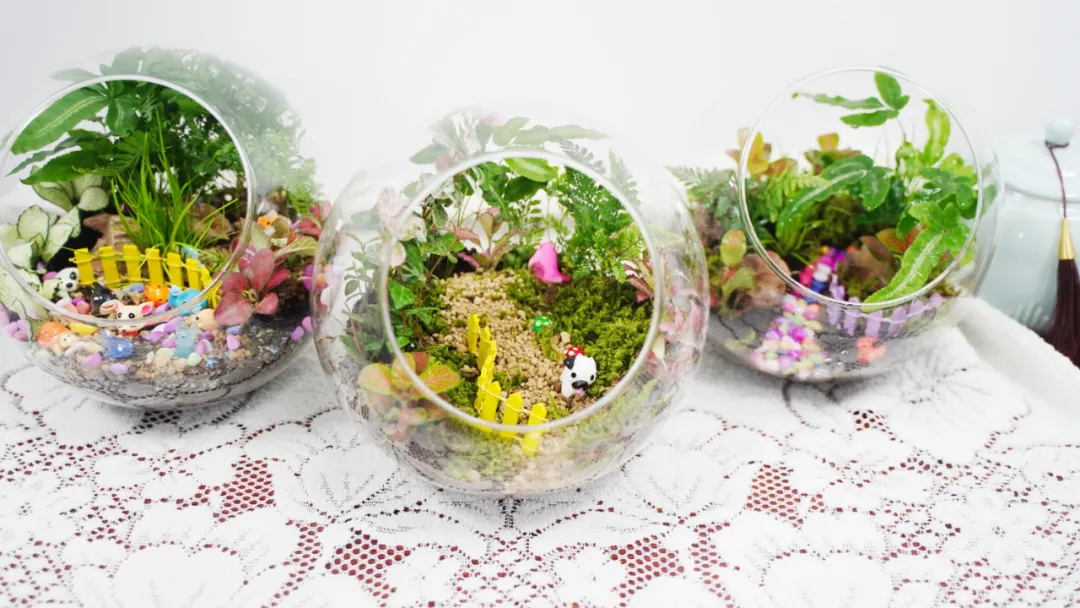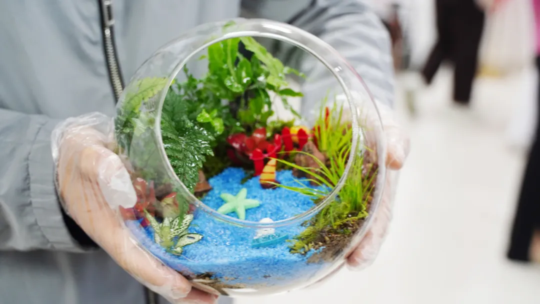 當苔蘚微景觀主題活動的序幕正式拉開,在專業(yè)老師的現(xiàn)場悉心指導下,大家紛紛投入到微景觀DIY制作之中,盡情享受著其中的樂趣。只見大家忙得熱火朝天,有條不紊地進行著每一個步驟:先是放入陶粒,為整個微景觀奠定基礎(chǔ);接著鋪上水苔,仿佛為大地鋪上一層柔軟的綠毯;再填入黏土,塑造出不同的地形;然后種上各種植物,讓綠色充滿這個小世界;放入苔蘚,增添一抹自然的生機;最后配上可愛的玩偶,賦予整個微景觀獨特的靈魂。在這個微景觀的小小世界里,每一個人都仿佛化身為巧手匠心的藝術(shù)家,將對生活的熱愛融入其中,展現(xiàn)出心靈手巧的一面,在玻璃器皿中精心創(chuàng)造出風格各異的“森林系”“海洋系”景觀。