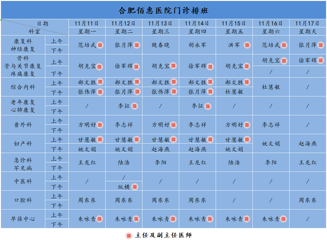 為方便廣大市民了解合肥佰惠醫(yī)院門(mén)診醫(yī)師出診安排,現(xiàn)發(fā)布下周(11月11日-11月17日)門(mén)診醫(yī)師排班表,請(qǐng)大家合理安排就診時(shí)間。如遇停診、換診等特殊情況有所調(diào)整,以當(dāng)日出診安排為準(zhǔn),造成不便敬請(qǐng)諒解!