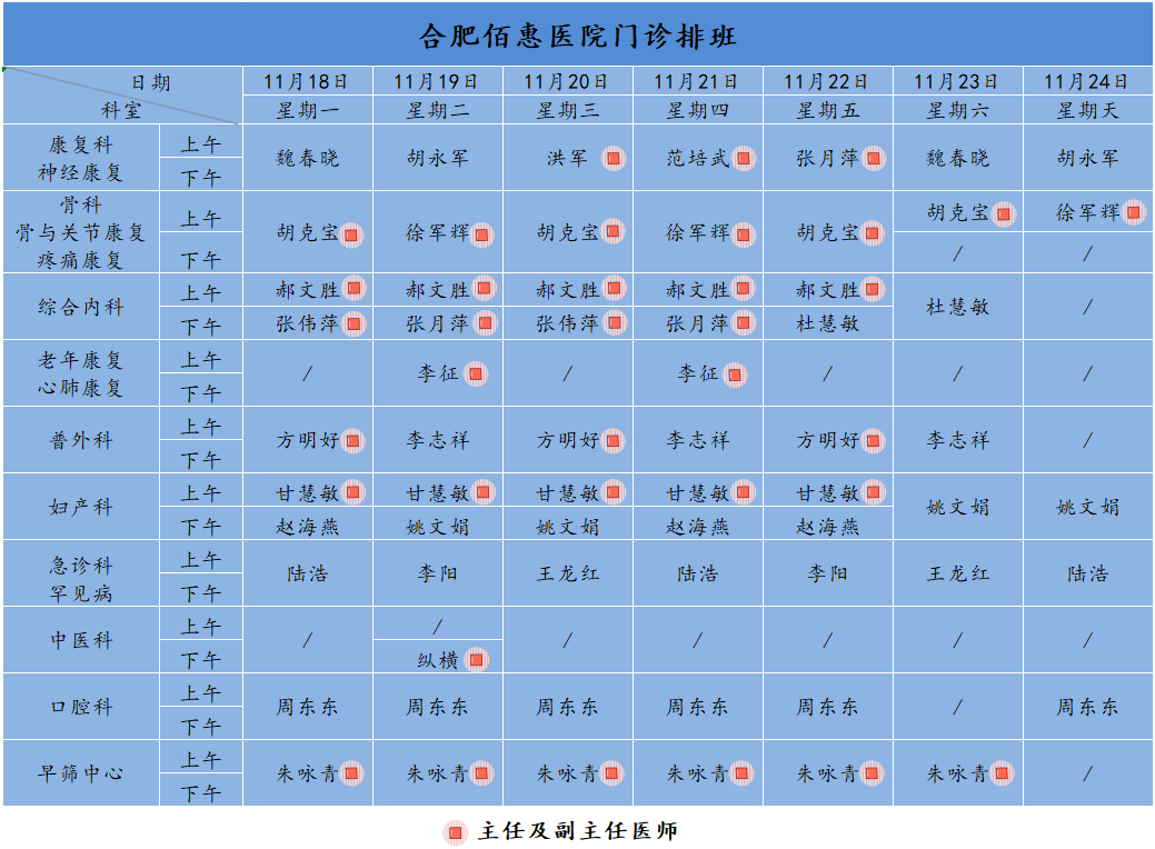 為方便廣大市民了解合肥佰惠醫(yī)院門診醫(yī)師出診安排,現(xiàn)發(fā)布下周(11月18日-11月24日)門診醫(yī)師排班表,請大家合理安排就診時間。如遇停診、換診等特殊情況有所調(diào)整,以當(dāng)日出診安排為準,造成不便敬請諒解!