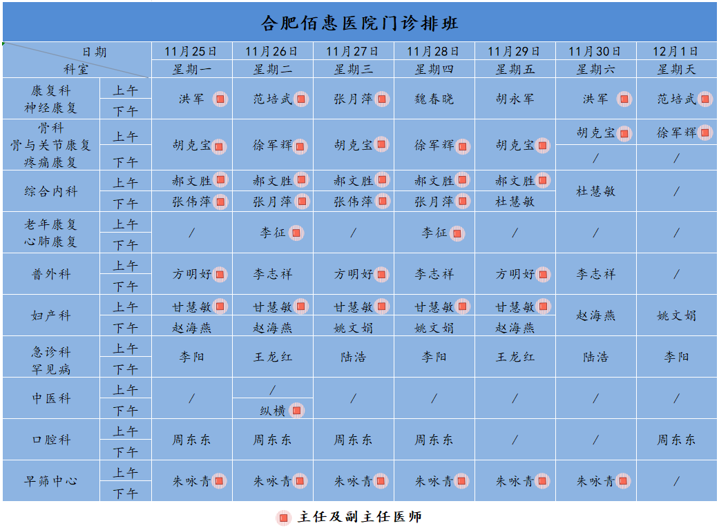 為方便廣大市民了解合肥佰惠醫(yī)院門診醫(yī)師出診安排,現(xiàn)發(fā)布下周(11月25日-12月1日)門診醫(yī)師排班表,請大家合理安排就診時(shí)間。如遇停診、換診等特殊情況有所調(diào)整,以當(dāng)日出診安排為準(zhǔn),造成不便敬請諒解!