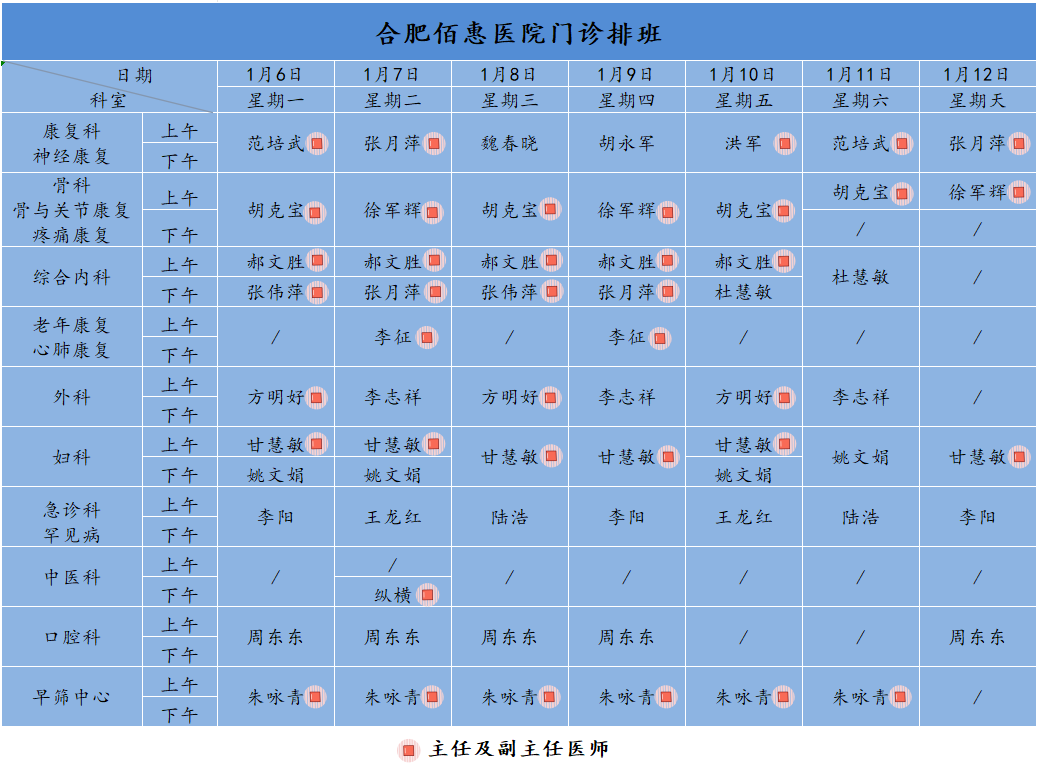 為方便廣大市民了解合肥佰惠醫(yī)院門診醫(yī)師出診安排,現(xiàn)發(fā)布下周(1月6日-1月12日)門診醫(yī)師排班表,請大家合理安排就診時間。如遇停診、換診等特殊情況有所調整,以當日出診安排為準,造成不便敬請諒解!