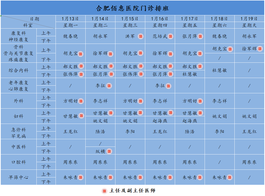 為方便廣大市民了解合肥佰惠醫(yī)院門診醫(yī)師出診安排,現(xiàn)發(fā)布下周(1月13日-1月19日)門診醫(yī)師排班表,請大家合理安排就診時間。如遇停診、換診等特殊情況有所調(diào)整,以當日出診安排為準,造成不便敬請諒解!