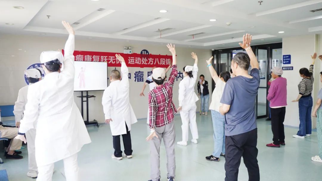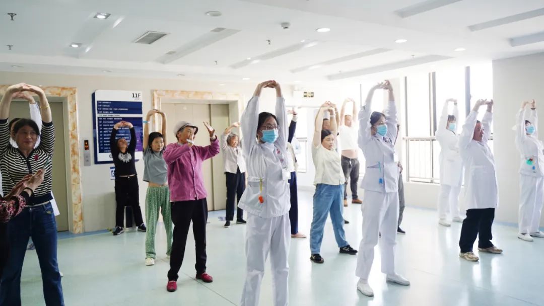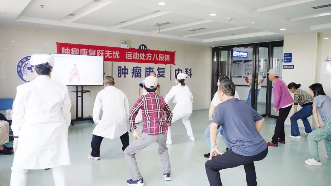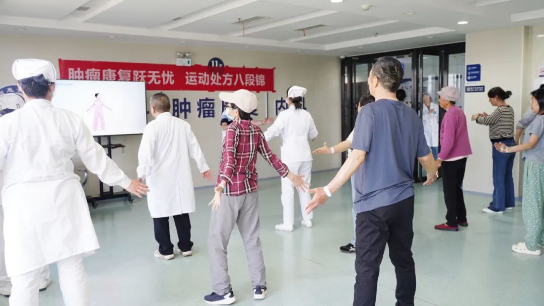 “健身氣功八段錦,預(yù)備式,左腳開步,與肩同寬,屈膝下蹲,掌抱腹前......”每天下午四點(diǎn)半,舒緩的音樂、清脆的口令就在病區(qū)準(zhǔn)時(shí)響起。醫(yī)護(hù)人員帶領(lǐng)患者、家屬及陪護(hù)人員,共同練習(xí)腫瘤康復(fù)運(yùn)動(dòng)處方——八段錦。大家表情淡定恬然,動(dòng)作協(xié)調(diào)有力,充滿美感,許多患者表示“一套八段錦練習(xí)下來,感覺周身輕松多了,連呼吸也更為順暢了”。