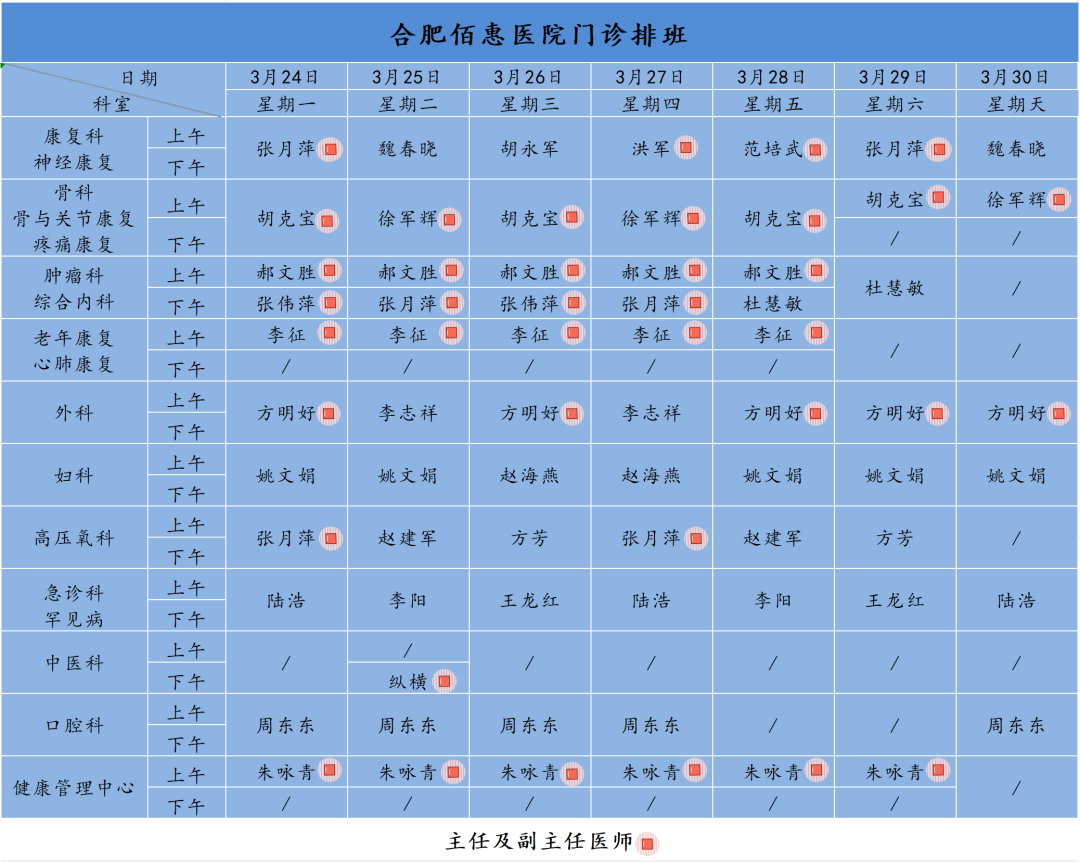 為方便廣大市民了解合肥佰惠醫(yī)院門(mén)診醫(yī)師出診安排,現(xiàn)發(fā)布下周(3月24日-3月30日)門(mén)診醫(yī)師排班表,請(qǐng)大家合理安排就診時(shí)間。如遇停診、換診等特殊情況有所調(diào)整,以當(dāng)日出診安排為準(zhǔn),造成不便敬請(qǐng)諒解!
