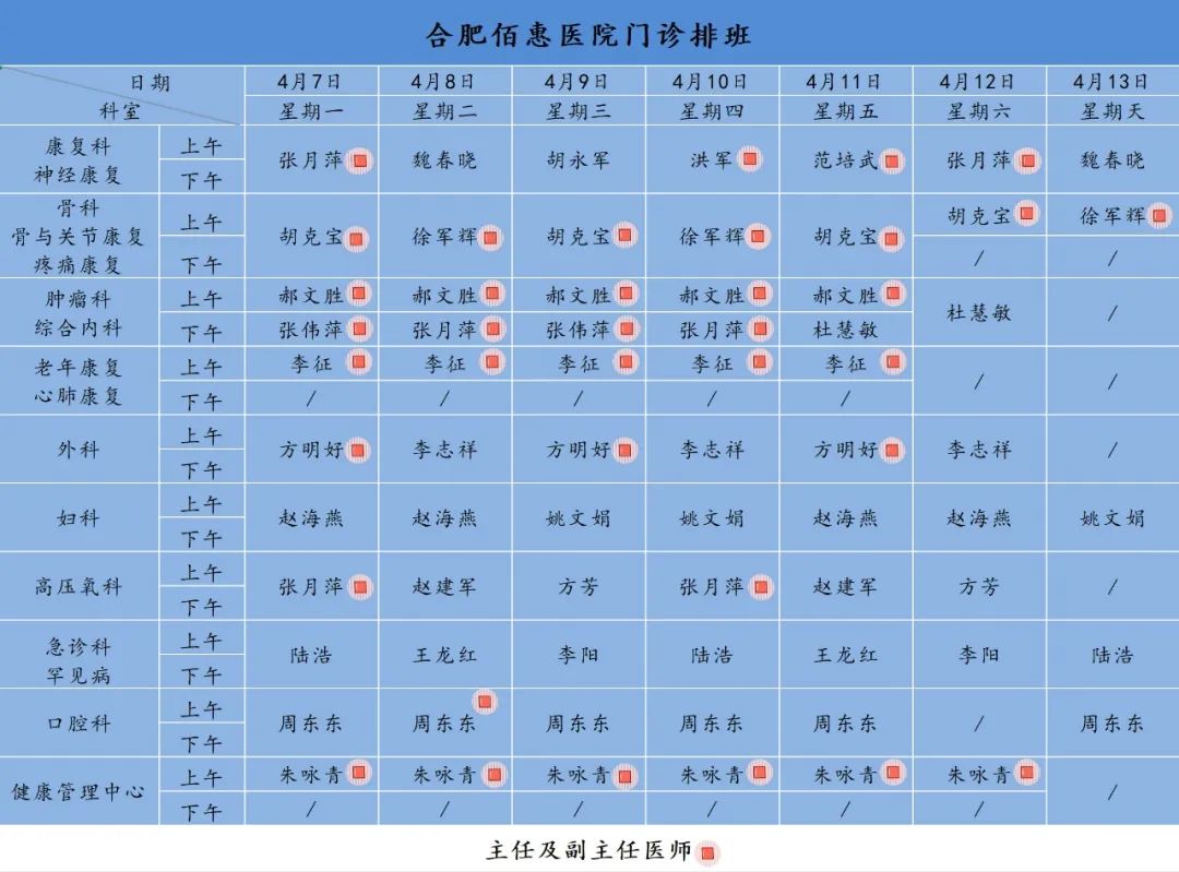 為方便廣大市民了解合肥佰惠醫(yī)院門診醫(yī)師出診安排,現(xiàn)發(fā)布下周(4月7日-4月13日)門診醫(yī)師排班表,請大家合理安排就診時間。如遇停診、換診等特殊情況有所調(diào)整,以當日出診安排為準,造成不便敬請諒解!