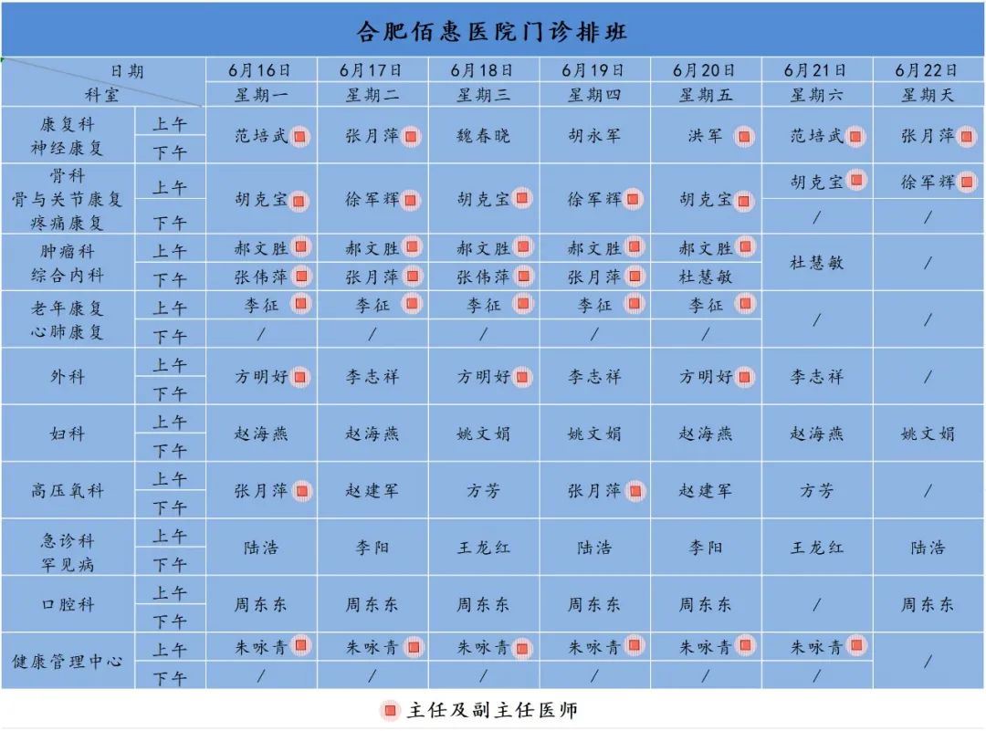 為方便廣大市民了解合肥佰惠醫(yī)院門診醫(yī)師出診安排,現(xiàn)發(fā)布下周(6月16日-6月22日)門診醫(yī)師排班表,請(qǐng)大家合理安排就診時(shí)間。如遇停診、換診等特殊情況有所調(diào)整,以當(dāng)日出診安排為準(zhǔn),造成不便敬請(qǐng)諒解!