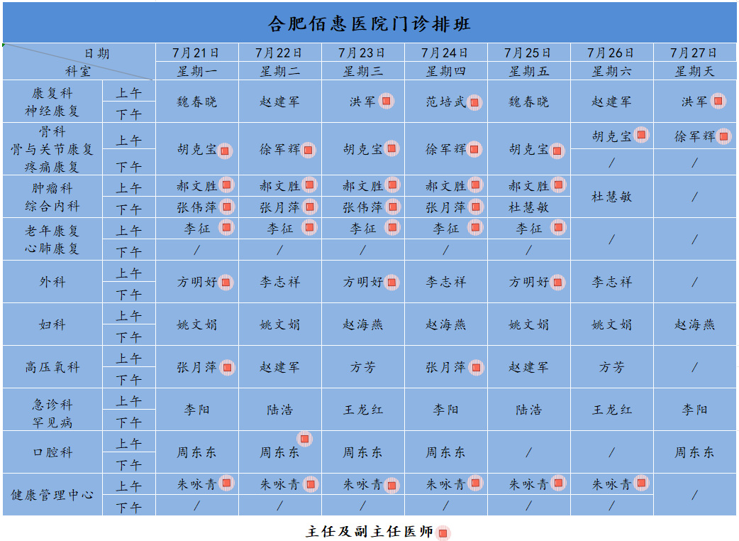 為方便廣大市民了解合肥佰惠醫(yī)院門診醫(yī)師出診安排,現(xiàn)發(fā)布本周(7月21日-7月27日)門診醫(yī)師排班表,請(qǐng)大家合理安排就診時(shí)間。如遇停診、換診等特殊情況有所調(diào)整,以當(dāng)日出診安排為準(zhǔn),造成不便敬請(qǐng)諒解!