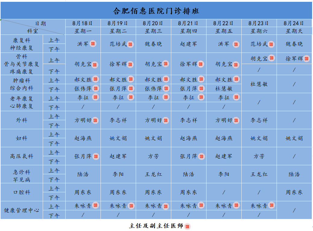 為方便廣大市民了解合肥佰惠醫(yī)院門診醫(yī)師出診安排,現(xiàn)發(fā)布本周(8月18日-8月24日)門診醫(yī)師排班表,請大家合理安排就診時間。如遇停診、換診等特殊情況有所調(diào)整,以當日出診安排為準,造成不便敬請諒解!