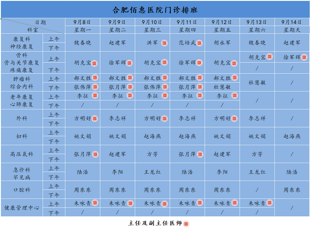 為方便廣大市民了解合肥佰惠醫(yī)院門診醫(yī)師出診安排,現(xiàn)發(fā)布本周(9月8日-9月14日)門診醫(yī)師排班表,請大家合理安排就診時間。如遇停診、換診等特殊情況有所調(diào)整,以當日出診安排為準,造成不便敬請諒解!