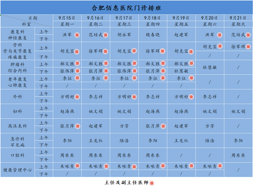 為方便廣大市民了解合肥佰惠醫(yī)院門診醫(yī)師出診安排,現(xiàn)發(fā)布本周(9月15日-9月21日)門診醫(yī)師排班表,請大家合理安排就診時(shí)間。如遇停診、換診等特殊情況有所調(diào)整,以當(dāng)日出診安排為準(zhǔn),造成不便敬請諒解!